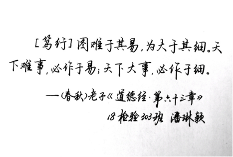 活動采取了軟筆和硬筆兩種形式,我系學(xué)生積極踴躍地參加,共收到七十余份作品。參賽作品都個性十足,抬手提筆,盡其所能地展示自身書法才能,或蒼勁有力、或飄逸清秀,一筆一劃間都彰顯著漢字的獨特魅力,充滿了對習(xí)近平新時代中國特色社會主義思想的歌頌與弘揚。經(jīng)系部嚴(yán)格篩選、反復(fù)斟酌,選出軟筆和硬筆各五幅優(yōu)秀作品,進(jìn)行展示。