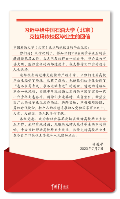 中共中央總書(shū)記、國(guó)家主席、中央軍委主席習(xí)近平77日給中國(guó)石油大學(xué)(北京)克拉瑪依校區(qū)畢業(yè)生回信,肯定他們到邊疆基層工作的選擇,對(duì)廣大高校畢業(yè)生提出殷切期望。