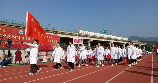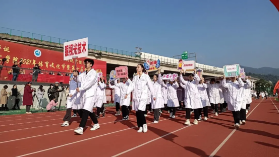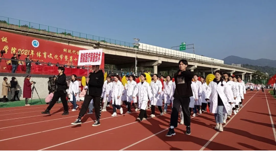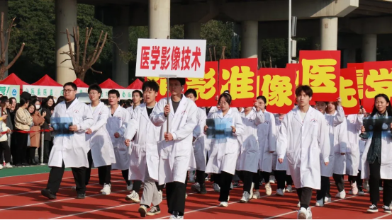 伴隨著運動員進(jìn)行曲,各專業(yè)代表隊逐一入場檢閱。醫(yī)學(xué)技術(shù)系四個專業(yè)方陣以昂揚的精神面貌、嘹亮的口號、整齊的步伐亮相在全體同學(xué)面前。