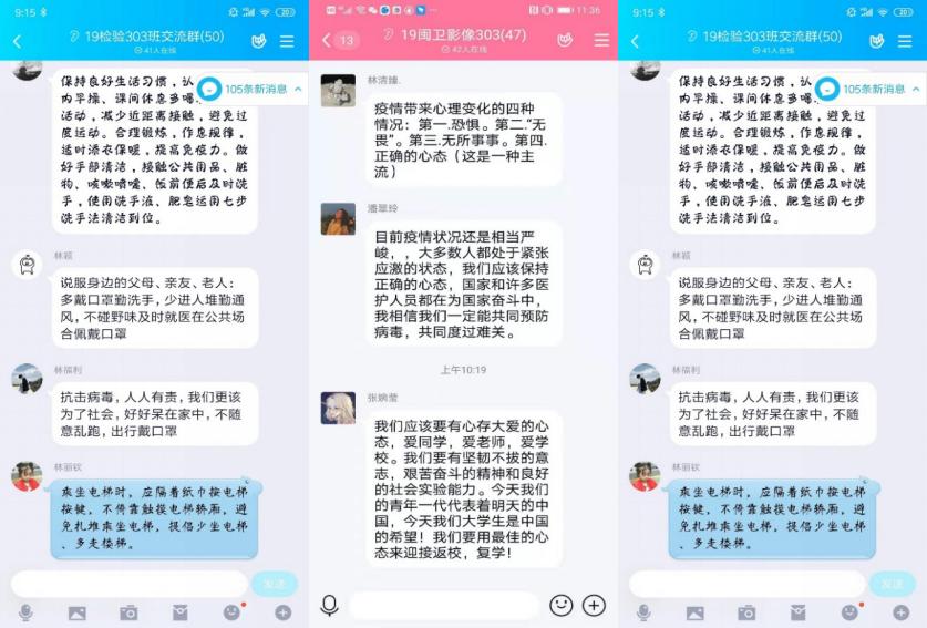 在新冠肺炎疫情防控的戰(zhàn)線(xiàn)上,輔導(dǎo)員們通過(guò)班群每日組織學(xué)生“云”打卡、排摸學(xué)生健康情況,盡職盡責(zé)地宣傳防控知識(shí),組織學(xué)習(xí)開(kāi)展心理健康學(xué)習(xí),用貼近學(xué)生的話(huà)語(yǔ)去傳播防疫的信念、溫暖、愛(ài)與力量。