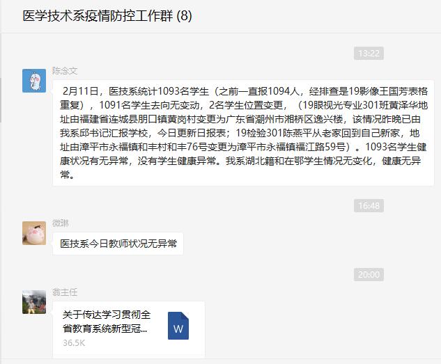 醫(yī)學(xué)技術(shù)系防控工作領(lǐng)導(dǎo)小組及時(shí)傳達(dá)和學(xué)習(xí)有關(guān)通知精神,研究制定《醫(yī)學(xué)技術(shù)系防范新型冠狀病毒應(yīng)急預(yù)案》,每日通報(bào)系部師生健康情況。