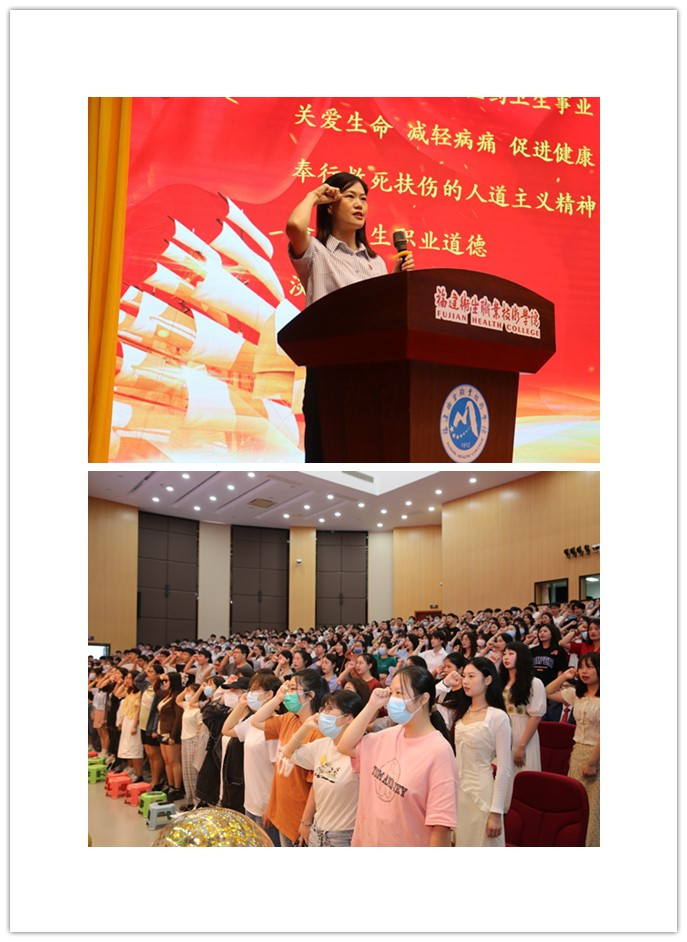 在2020年福建省職業(yè)院校教師教學(xué)能力比賽一等獎獲得者雷娟娟老師領(lǐng)誓下,全體畢業(yè)生莊嚴(yán)進(jìn)行畢業(yè)宣誓。“健康所系,性命相托……”一句句鏗鏘有力的誓詞,回蕩會場,激勵師生們不忘初心,砥礪前行。