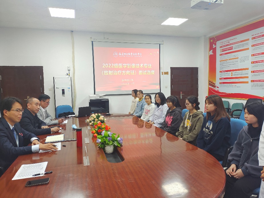 為了加強(qiáng)校企合作,醫(yī)學(xué)技術(shù)系于2022年12月9日下午舉辦2022級(jí)放射治療方向班面試選拔會(huì)。為了選拔出更加適合放射治療方向?qū)I(yè)學(xué)習(xí)的學(xué)生,系部特別邀請(qǐng)了福建省腫瘤醫(yī)院的吳君心、姚奇?zhèn)ァ⒏等f(wàn)凱、陳超等4位醫(yī)院帶教老師來(lái)?yè)?dān)任此次面試的專家評(píng)委,參加本次面試的是來(lái)自22級(jí)醫(yī)學(xué)影像技術(shù)專業(yè)的57名學(xué)生。