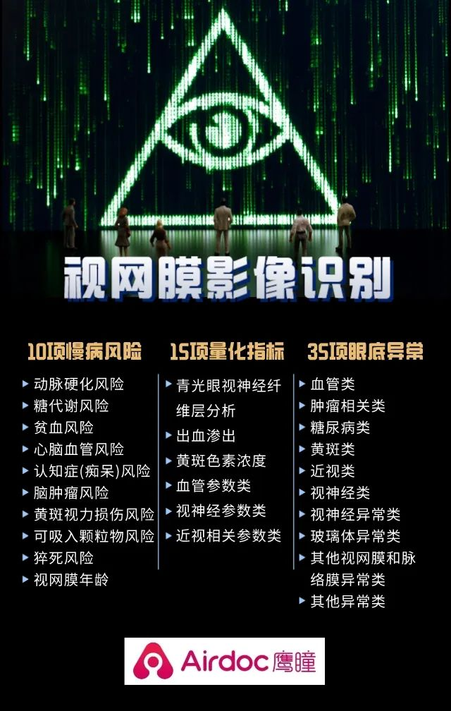 僅需30秒到1分鐘,一張張眼底視網(wǎng)膜照片,就從一臺白色的便攜式眼底相機傳送至AI人工智能云平臺。通過視網(wǎng)膜影像識別,鷹瞳Airdoc創(chuàng)新AI慢病風(fēng)險評估與眼底疾病診斷技術(shù),即可逐一為受檢者詳細分析10項健康風(fēng)險評估+15項量化指標+35項眼底異常。