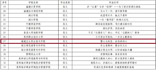 近日,福建省教育廳關(guān)工委通報(bào)2023年“讀懂中國(guó)”活動(dòng)作品評(píng)審結(jié)果,我校關(guān)工委獲全國(guó)優(yōu)秀組織獎(jiǎng),我院選送的《警心永向黨,余熱映初心》獲評(píng)全省最佳征文作品,《捧出一顆丹心,獻(xiàn)與億兆生靈》、《勞模精神不褪色,鼓蕩丹心永綿延》獲評(píng)全省優(yōu)秀征文作品。