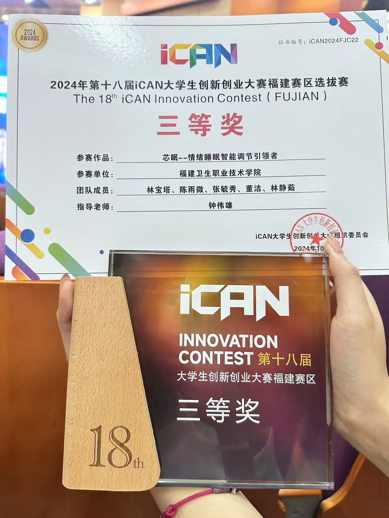 2024年10月19日,第十八屆iCAN大學(xué)生創(chuàng)新創(chuàng)業(yè)大賽福建賽區(qū)選拔賽在福州大學(xué)至誠學(xué)院圓滿落幕。我校報送的參賽項目《芯眠-情緒睡眠智能調(diào)節(jié)引領(lǐng)者》項目獲得三等獎。這是我校首次在該項賽事獲獎。