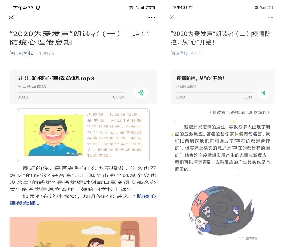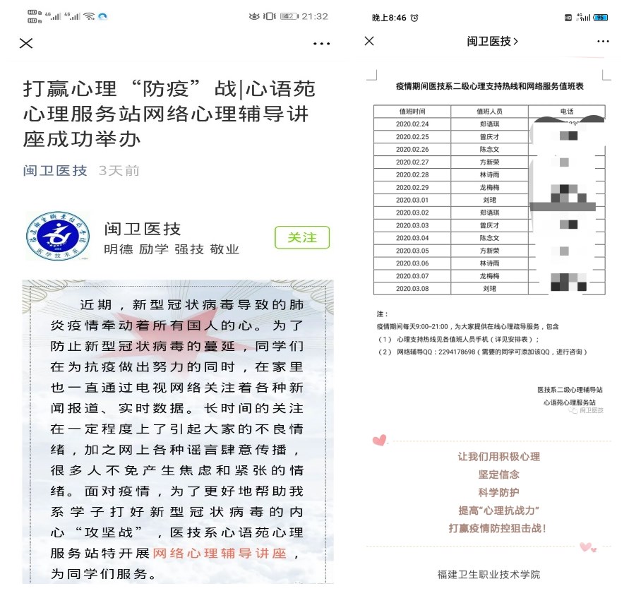 疫情發(fā)生以來,醫(yī)技系學(xué)生管理一手抓學(xué)生疫情摸排信息,一手抓學(xué)生各項(xiàng)常規(guī)工作。面向不同類型的困難學(xué)生,力求做到個(gè)性化幫扶、人性化關(guān)愛。針對家庭經(jīng)濟(jì)困難學(xué)生,輔導(dǎo)員注重解決思想問題與解決實(shí)際問題相結(jié)合,積極幫助符合條件的學(xué)生申請“防疫期間臨時(shí)困難補(bǔ)助”,及時(shí)送上經(jīng)濟(jì)關(guān)懷;持續(xù)推進(jìn)畢業(yè)班的就業(yè)指導(dǎo)和服務(wù)工作,在班級(jí)群及時(shí)推送各類網(wǎng)絡(luò)就業(yè)招聘會(huì)信息和企業(yè)招聘信息,助推應(yīng)屆畢業(yè)生就業(yè)工作,為家庭經(jīng)濟(jì)困難同學(xué)提供“網(wǎng)絡(luò)流量資費(fèi)資助”,緩解應(yīng)屆畢業(yè)生的生活壓力;針對心理“防疫”,醫(yī)技系心理輔導(dǎo)站將學(xué)生心理健康納入整體防控工作,開通疫情期間心理支持熱線和網(wǎng)絡(luò)服務(wù),邀請臨床心理醫(yī)生開展“新冠肺炎疫情下的心理援助熱線原則及方法”線上培訓(xùn),策劃心言心語系列活動(dòng)之“2020為愛發(fā)聲”朗讀者聲音療愈計(jì)劃,發(fā)揮“朋輩心理輔導(dǎo)”作用,切實(shí)做到抗“疫”與暖心并舉、防疫與育人結(jié)合。