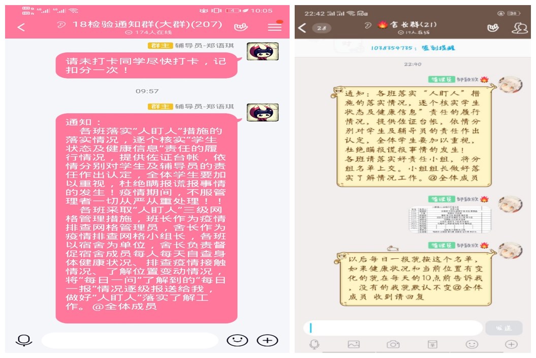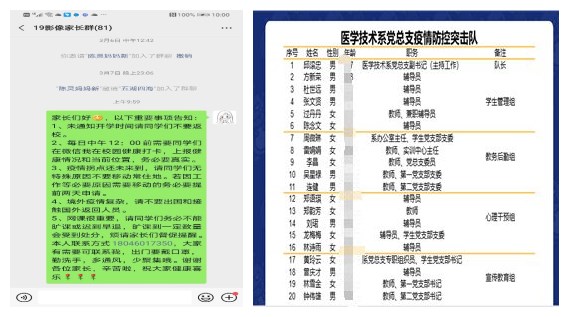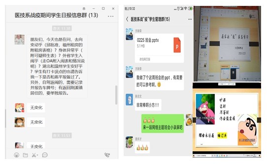 新冠肺炎疫情發(fā)生以來,醫(yī)學(xué)技術(shù)系成立黨員醫(yī)學(xué)技術(shù)系黨總支疫情防控黨員突擊隊(duì),并由一線輔導(dǎo)員組成學(xué)生管理組,組織力量開展防控,依法依規(guī)有序管控。構(gòu)建學(xué)生“系部—輔導(dǎo)員—班級(jí)”預(yù)防控制體系,創(chuàng)建“人盯人”三級(jí)網(wǎng)格管理模式,充分調(diào)動(dòng)并發(fā)揮黨員骨干、學(xué)生干部、舍長等力量與作用。以輔導(dǎo)員為一級(jí)網(wǎng)格,班長為二級(jí)網(wǎng)格,舍長為三級(jí)網(wǎng)格,每一個(gè)班級(jí)參照網(wǎng)格管理制度設(shè)立以宿舍為單位的網(wǎng)格,將舍長設(shè)置為疫情排查網(wǎng)格管理員。重點(diǎn)對象采用一對一、多對一的舉措,每天由舍長上報(bào)宿舍成員的去向及健康狀況,保證逐個(gè)落實(shí)、實(shí)時(shí)掌控。明確每一層級(jí)具體負(fù)責(zé)人,嚴(yán)格落實(shí)疫情信息逐級(jí)報(bào)告制度;為確?!翱?、準(zhǔn)、穩(wěn)”掌握學(xué)生動(dòng)態(tài)情況,做到不留糊涂賬、不打無底仗,醫(yī)技系輔導(dǎo)員以點(diǎn)帶面,織網(wǎng)管理,借助視頻、語音等多種途徑,通過見真人、聽原聲、察實(shí)情的形式,精準(zhǔn)系統(tǒng)把握學(xué)生的信息和健康狀況,切實(shí)做到防控工作的橫向到邊、縱向到底,不留死角;每周開展線上班會(huì),向?qū)W生反復(fù)強(qiáng)調(diào)未接到學(xué)校返校通知一律不得提前返校,教育學(xué)生以居家為主,盡量減少出門,減少與人接觸,無特殊原因不要擅自離開現(xiàn)居住地;加強(qiáng)對實(shí)習(xí)生的管理,要求不得擅自返回實(shí)習(xí)地,對特殊原因需提前返程在校外租住的實(shí)習(xí)生進(jìn)行實(shí)時(shí)監(jiān)測;加強(qiáng)與學(xué)生家長的溝通,暢通家校聯(lián)系途徑。輔導(dǎo)員明確將不得提前返校、做好線上教學(xué)準(zhǔn)備等要求告知家長,做到重要信息雙線并聯(lián)推送,充分發(fā)揮學(xué)生家長的強(qiáng)心劑作用,共同把好學(xué)生健康關(guān)、學(xué)習(xí)關(guān)。