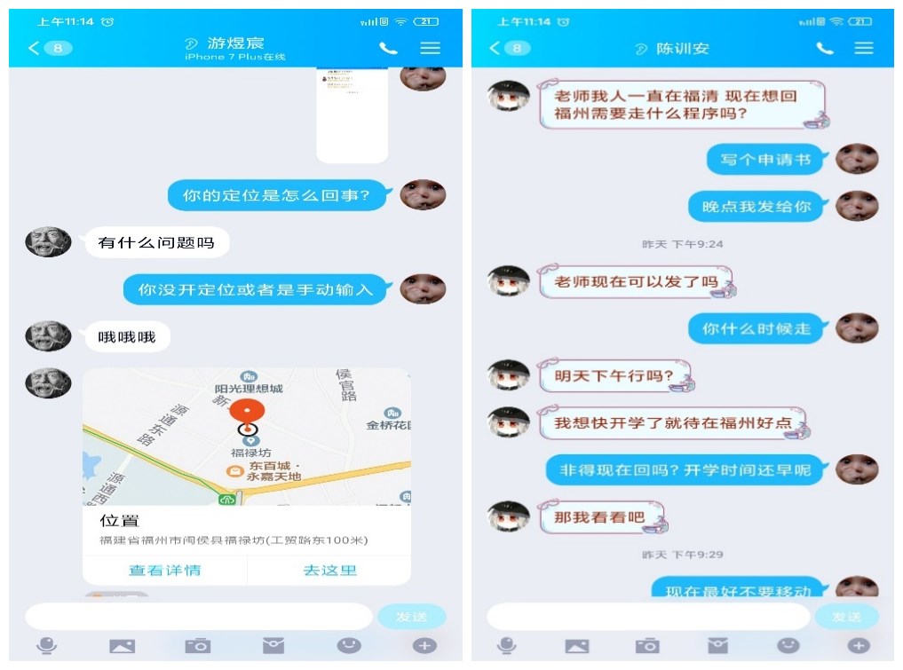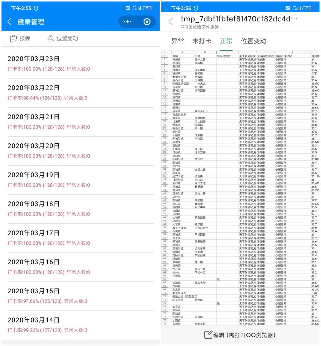 利用微信小程序“我在校園”,開展數(shù)據(jù)信息化收集工作,通過定位簽到和健康管理模塊,建立 “人盯人”跟蹤管理臺(tái)賬。在靜態(tài)臺(tái)賬的基礎(chǔ)上,堅(jiān)持日報(bào)告、零報(bào)告、異常情況一事一報(bào)制度,全面準(zhǔn)確掌握學(xué)生現(xiàn)居住地及信息變動(dòng)、居住區(qū)域疫情情況、個(gè)人健康狀況、親密接觸人員健康狀況等信息,動(dòng)態(tài)實(shí)時(shí)更新學(xué)生健康信息。完善信息報(bào)送工作機(jī)制,每天中午十二點(diǎn)前完成所有學(xué)生的去向變化、健康狀況調(diào)查,基本消除信息死角。通過“班級(jí)—輔導(dǎo)員—系部”三級(jí)對數(shù)據(jù)進(jìn)行審核研判,確保信息排查零差錯(cuò)。一旦發(fā)現(xiàn)報(bào)送數(shù)據(jù)異常,輔導(dǎo)員通過電話、短信以及微信、QQ等網(wǎng)絡(luò)方式,主動(dòng)聯(lián)系、全面摸清,確保實(shí)時(shí)準(zhǔn)確掌握情況。為防止學(xué)生報(bào)告虛假方位和錯(cuò)誤信息,還采取“共享位置”、實(shí)時(shí)在線、即時(shí)聯(lián)絡(luò)等有效措施,確?!叭硕⑷恕惫ぷ髀涞綄?shí)處,避免出現(xiàn)虛報(bào)、瞞報(bào)、漏報(bào)、遲報(bào)情況。