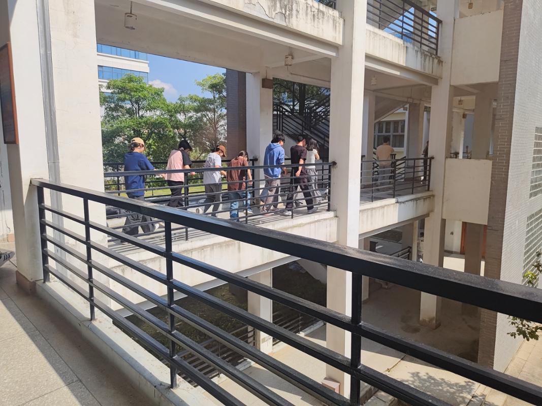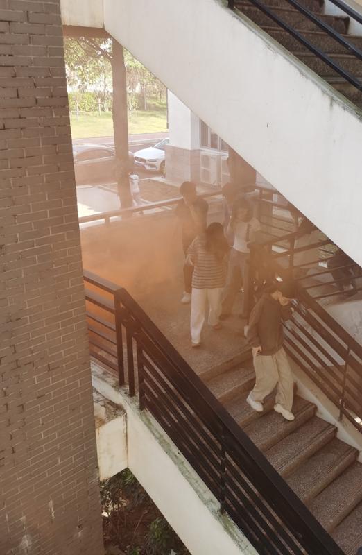 第二部分應(yīng)急逃生演練(消防、地震)。演練開(kāi)啟前安全工作處林澤文老師先詳細(xì)介紹消防器材的使用、演練程序、疏散信號(hào)、疏散路線、疏散順序等注意事項(xiàng),并強(qiáng)調(diào)在疏散過(guò)程中切勿擁擠、推搡導(dǎo)致踩踏事件發(fā)生。演練工作組接到演練指令后,燃放煙霧,平靜的院部樓館突然黃煙四起、警報(bào)鈴響,負(fù)責(zé)老師迅速到達(dá)指定崗位,學(xué)生們也隨之做出反應(yīng),在現(xiàn)場(chǎng)人員的指揮下,學(xué)生們紛紛用手、濕紙巾等捂住口鼻,彎著腰從預(yù)定的逃生路線進(jìn)行撤離,撤退中所有同學(xué)緊靠右行,撤退過(guò)程井然有序,參加本次演練師生全部安全撤離到指定區(qū)域。