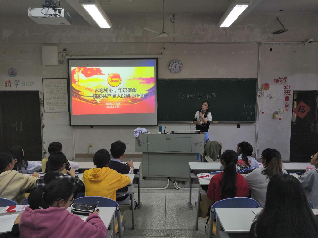 11月13日,藥學系黨總支在藥一階為本期業(yè)余分黨校學員講授主題為“解讀共產黨人的初心與使命”專題黨課,由學生黨支部高施老師主講。