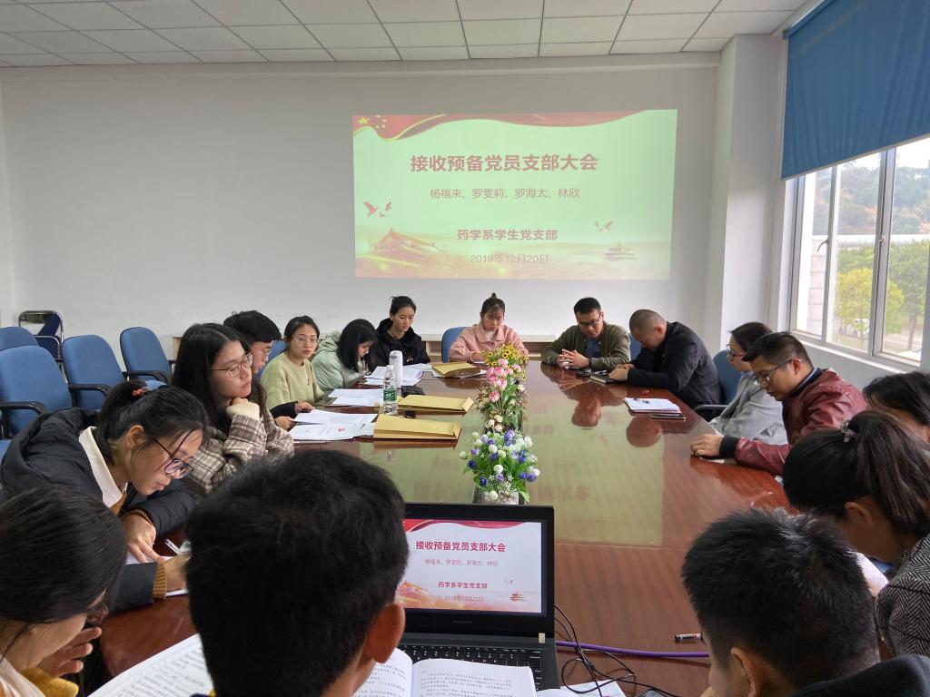 2019年12月20日下午,福建衛(wèi)生職業(yè)技術(shù)學(xué)院藥學(xué)系學(xué)生黨支部于藥學(xué)系207會(huì)議室召開(kāi)接收預(yù)備黨員大會(huì),討論關(guān)于楊福來(lái)、羅雯莉、羅海太、林欣等4名同志考察期滿擬轉(zhuǎn)中共預(yù)備黨員事宜。大會(huì)由藥學(xué)系學(xué)生黨支部陳翰書記主持,藥學(xué)系黨總支賴文金副書記及各支部黨員出席大會(huì)。