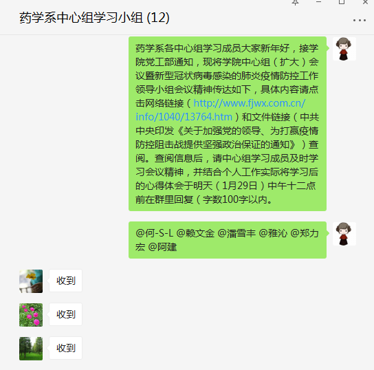 藥學(xué)系根據(jù)不同群體多形式開展學(xué)習(xí)活動(dòng)。藥學(xué)系全體教職工通過(guò)微信群,詳細(xì)閱讀學(xué)習(xí)材料;各教研室組織教師圍繞學(xué)習(xí)內(nèi)容展開探討;中心組(擴(kuò)大)成員根據(jù)工作實(shí)際發(fā)表學(xué)習(xí)體會(huì);各輔導(dǎo)員通過(guò)qq視頻會(huì)議召開主題班會(huì);各班級(jí)同學(xué)通過(guò)qq語(yǔ)音交流學(xué)習(xí)心得。