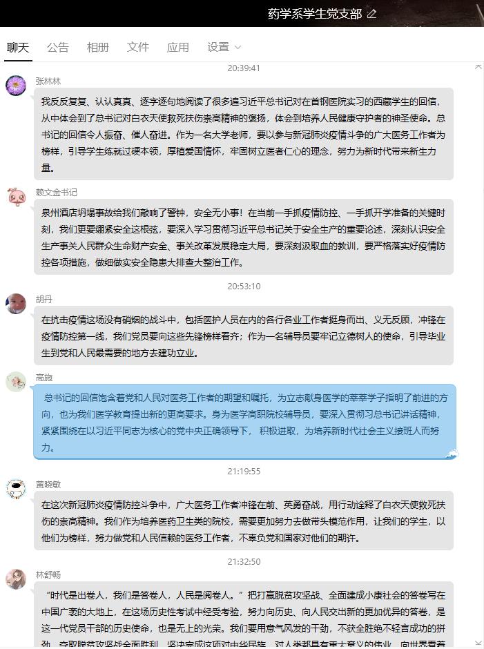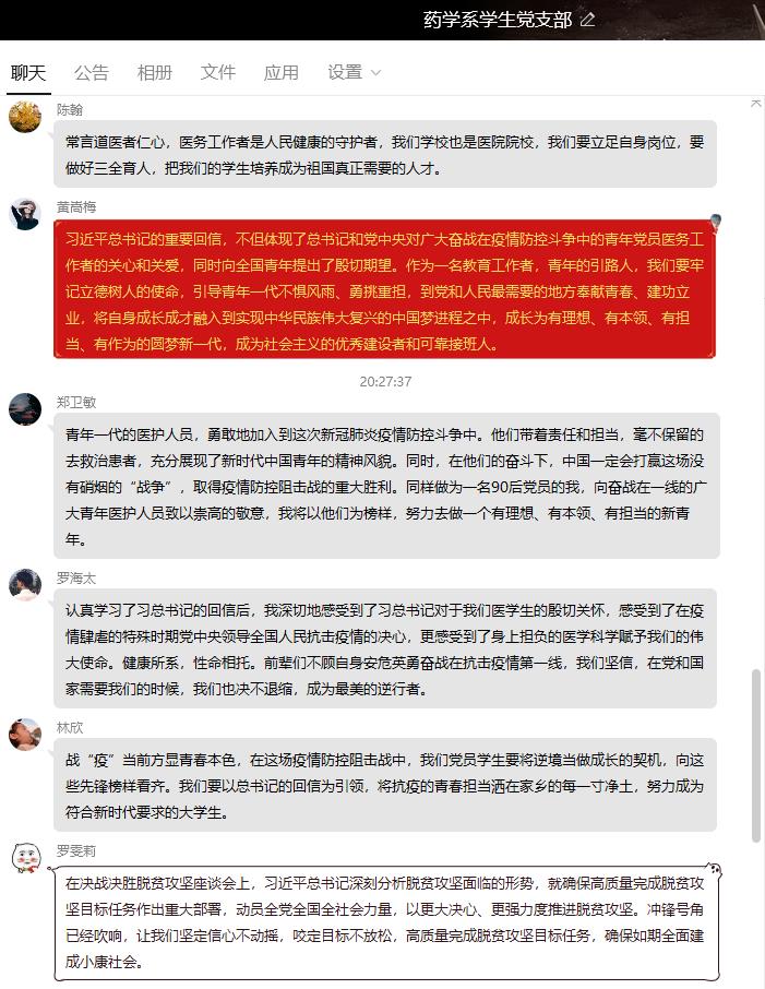 在一手抓疫情防控、一手抓開學準備的關鍵時刻,3月21日晚,藥學系學生黨支部通過QQ平臺集中學習中共中央辦公廳《黨委(黨組)落實全面從嚴治黨主體責任規(guī)定》《新時代高等學校思想政治理論課教師隊伍建設規(guī)定》,習近平總書記給在首鋼實習的西藏學生的回信、在脫貧攻堅座談會上的講話等文件及我省關于泉州市欣佳酒店坍塌事故處置和安全隱患大排查大整治的省委常委會會議精神。