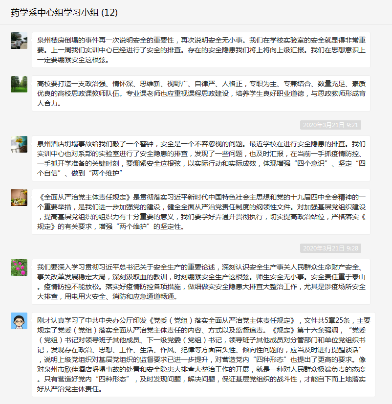 2020年3月21日,藥學(xué)系黨總支在微信群召開(kāi)中心組學(xué)習(xí)(擴(kuò)大)會(huì)議,會(huì)議由藥學(xué)系黨總支書(shū)記鄭力宏主持。