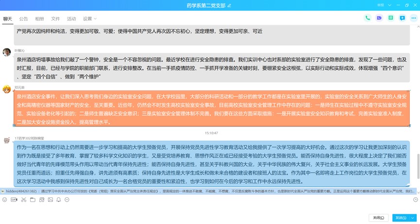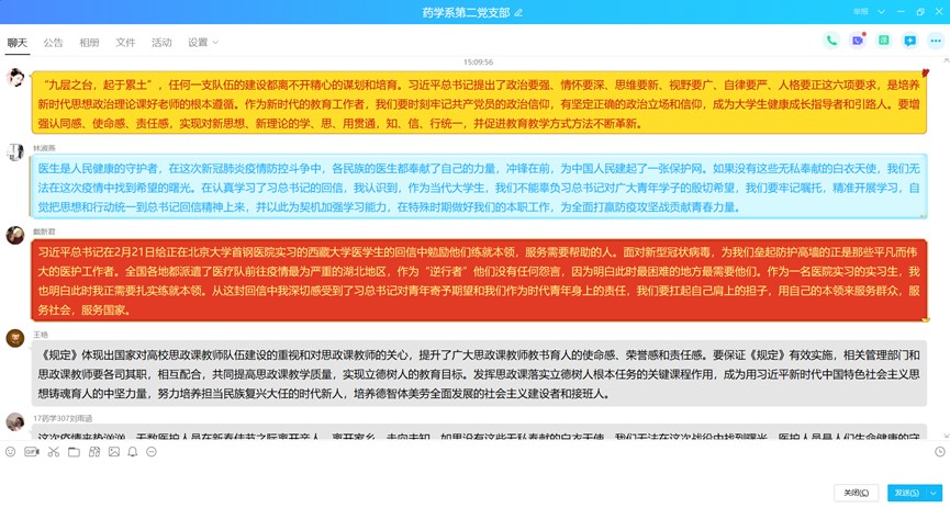自主學(xué)習(xí)后,鄧元榮同志在支部微信群中組織視頻連線,支部黨員圍繞學(xué)習(xí)內(nèi)容紛紛發(fā)表學(xué)習(xí)感想。潘雪豐同志強(qiáng)調(diào)了按照“價(jià)值引領(lǐng)、能力本位、知識(shí)教育”總體要求,深化課程思政教學(xué)改革的重要性。廖偉堅(jiān)同志則從從嚴(yán)治黨出發(fā),必須增強(qiáng)政治意識(shí)、大局意識(shí)、核心意識(shí)、看齊意識(shí),自覺維護(hù)黨中央權(quán)威和集中統(tǒng)一領(lǐng)導(dǎo),自覺在思想上政治上行動(dòng)上同黨中央保持高度一致。