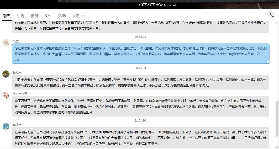 近日,北京大學(xué)援鄂醫(yī)療隊的34名“90后”黨員給習(xí)近平總書記寫信,匯報了在抗疫一線搶救生命的情況,表達了繼續(xù)發(fā)揮黨員作用、為打贏疫情防控阻擊戰(zhàn)貢獻力量的決心。總書記3月15日回信,激勵新時代青年要不懼風(fēng)雨、勇挑重?fù)?dān),讓青春在黨和人民最需要的地方綻放絢麗之花。據(jù)此,3月28日,藥學(xué)系學(xué)生黨支部開展主題黨日活動,學(xué)習(xí)習(xí)近平總書記給北京大學(xué)援鄂醫(yī)療隊全體“90后”黨員的回信精神。