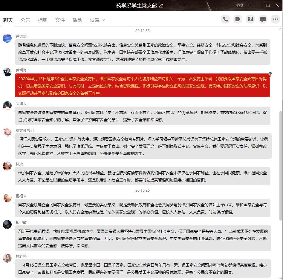 臨近“全民國家安全教育日”,為貫徹落實習近平總書記“總體國家安全觀”,切實將國家安全作為“安邦定國的基石”、擺在“頭等大事”的戰(zhàn)略高度,4月11日,藥學系學生黨支部通過QQ平臺集中學習國家安全教育相關內(nèi)容,支部全體師生黨員參與學習。