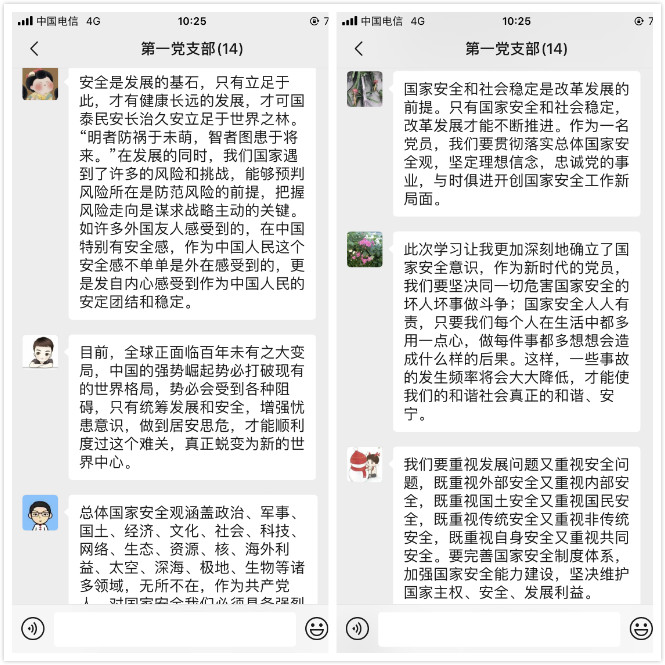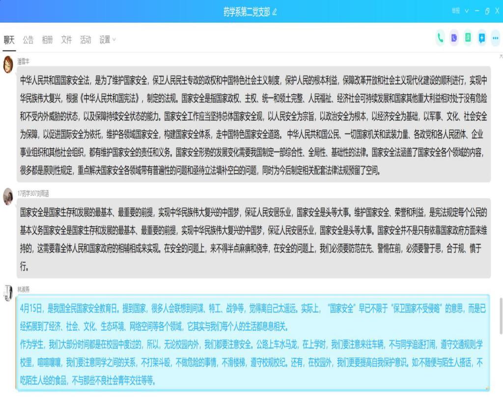 第一黨支部通過微信平臺(tái)組織學(xué)習(xí)《習(xí)近平新時(shí)代中國特色社會(huì)主義思想學(xué)習(xí)綱要》第十四章“堅(jiān)決維護(hù)國家主權(quán)、安全、發(fā)展利益”內(nèi)容,集體觀看《4.15貨架安全日宣傳動(dòng)畫片》。第二黨支部、學(xué)生黨支部通過微信、QQ平臺(tái)集中學(xué)習(xí)憲法中有關(guān)國家安全的規(guī)定及《國家安全法》《中華人民共和國保守國家秘密法》《中華人民共和國反間諜法》等國家安全法律法規(guī)。學(xué)習(xí)過程中,全體黨員立足崗位實(shí)際,紛紛發(fā)表心得體會(huì)。