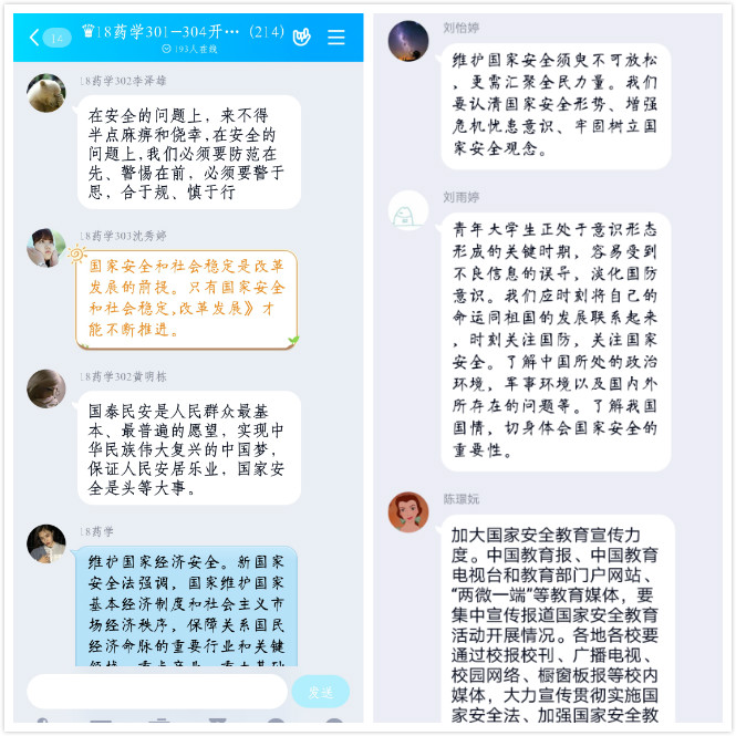 4月13日至14日,藥學(xué)系各班級(jí)通過QQ、釘釘?shù)染W(wǎng)絡(luò)平臺(tái),召開“國家安全教育日”主題班會(huì),1800余名學(xué)生以班級(jí)為單位集中學(xué)習(xí)國家安全教育相關(guān)內(nèi)容。主題班會(huì)上,輔導(dǎo)員們?cè)敿?xì)闡述了憲法中有關(guān)國家安全的規(guī)定,并結(jié)合疫情防控的特殊時(shí)期,再次強(qiáng)調(diào)牢固樹立安全意識(shí)、切實(shí)維護(hù)好生命財(cái)產(chǎn)安全的重要意義。