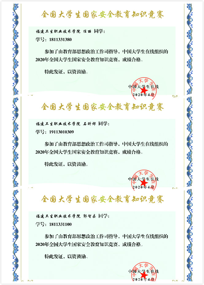 為進(jìn)一步鞏固國家安全教育線上專題學(xué)習(xí),藥學(xué)系學(xué)生積極參與中國大學(xué)生在線網(wǎng)組織的“2020年全國大學(xué)生國家安全知識(shí)競(jìng)賽”,并取得國家安全知識(shí)競(jìng)賽電子版證書,據(jù)悉,只有線上考試滿分者才可獲得電子版證書。