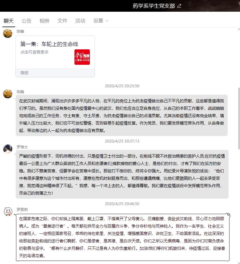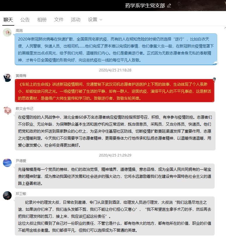 “這是生我養(yǎng)我的城市,我想總得有一束光,照亮大家前行的路”,平凡的人物、不平凡的貢獻(xiàn),4月25日晚,藥學(xué)系學(xué)生黨支部通過QQ平臺集中觀看學(xué)習(xí)“在武漢”系列記錄宣傳片第一集——車輪上的生命線,支部全體黨員觀看學(xué)習(xí)。