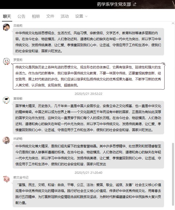 支部黨員表示,社會主義核心價值觀就是中華優(yōu)秀傳統(tǒng)文化的精華濃縮,我們要共同踐行社會主義核心價值觀,傳承中華優(yōu)秀傳統(tǒng)文化,身處特殊時期,肩負(fù)特殊使命,為打贏新冠肺炎疫情防控阻擊戰(zhàn)和脫貧攻堅戰(zhàn),為新時代、新福建建設(shè)和中華民族偉大復(fù)興貢獻力量。