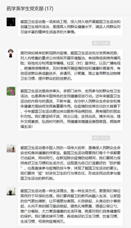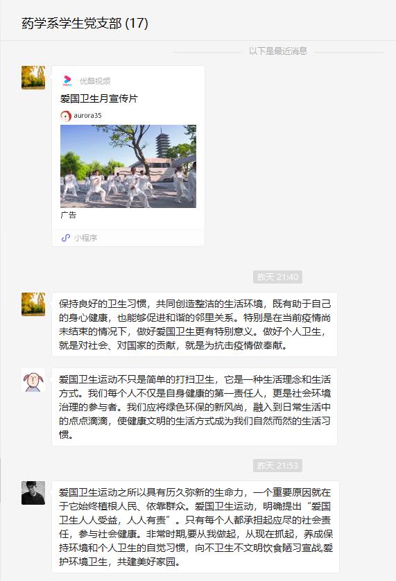 愛國衛(wèi)生人人受益,疫情防控人人有責(zé)。6月16日,藥學(xué)系學(xué)生黨支部通過微信平臺,觀看“愛國衛(wèi)生月宣傳片”,集中學(xué)習(xí)愛國衛(wèi)生運(yùn)動精神。