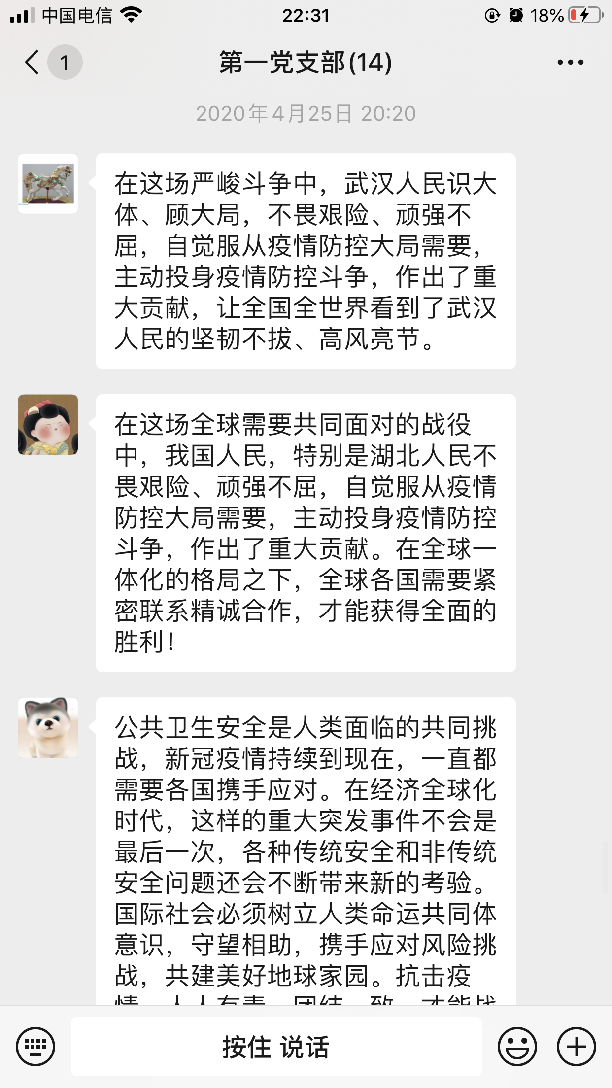 通過學(xué)習(xí),黨員同志紛紛表示,面對疫情,全國人民精誠團結(jié),萬眾一心,取得了抗擊疫情階段性的勝利,這是中國人民團結(jié)合作取得抗疫勝利的一個重要經(jīng)驗。當前新冠肺炎疫情正在全球蔓延,給世界人民生命安全和身體健康帶來了巨大的威脅,受感染人數(shù)和死亡人數(shù)在不斷的增加,給全球公共衛(wèi)生安全帶來巨大挑戰(zhàn),面對這種情況,只有采用中國經(jīng)驗,只有團結(jié)合作,才是國際社會戰(zhàn)勝疫情最有力的武器,只有國際社會團結(jié)合作,才能最終戰(zhàn)勝疫情。