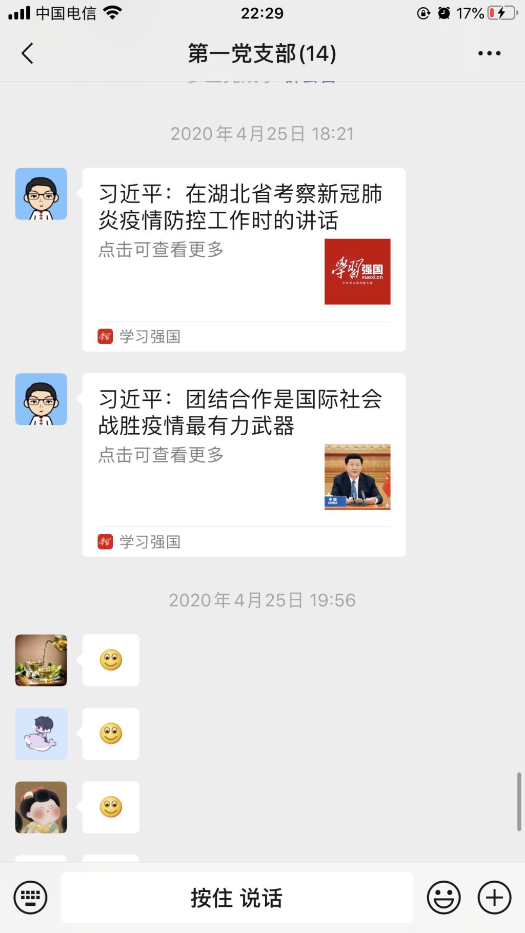 4月25日,藥學(xué)系第一黨支部通過微信平臺,集中學(xué)習(xí)“習(xí)近平在湖北省考察新冠肺炎疫情防控工作時的講話”、“習(xí)近平:團結(jié)合作是國際社會戰(zhàn)勝疫情最有力武器”等內(nèi)容,活動由支部書記何舒瀾主持。