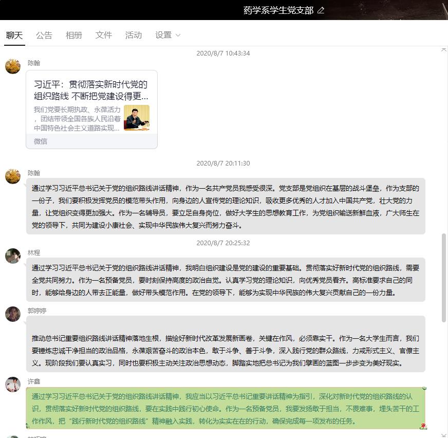 習(xí)近平總書記曾指出,“我們黨要長(zhǎng)期執(zhí)政、永葆活力,團(tuán)結(jié)帶領(lǐng)全國(guó)各族人民沿著中國(guó)特色社會(huì)主義道路實(shí)現(xiàn)中華民族偉大復(fù)興,最重要的是把黨建設(shè)得更加堅(jiān)強(qiáng)有力”。8月7日,藥學(xué)系學(xué)生黨支部通過QQ平臺(tái),集中學(xué)習(xí)習(xí)近平“貫徹落實(shí)新時(shí)代黨的組織路線,不斷把黨建設(shè)得更加堅(jiān)強(qiáng)有力”講話精神,支部全體師生黨員參與學(xué)習(xí)。