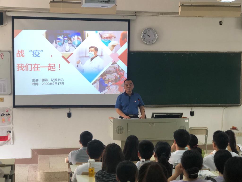 9月17日上午,院紀(jì)委書記游鋒在教學(xué)樓115教室為藥學(xué)系學(xué)子講授以“戰(zhàn)疫,我們在一起”為主題的開學(xué)第一課,呈現(xiàn)了一場生動感人的返校戰(zhàn)疫課堂。