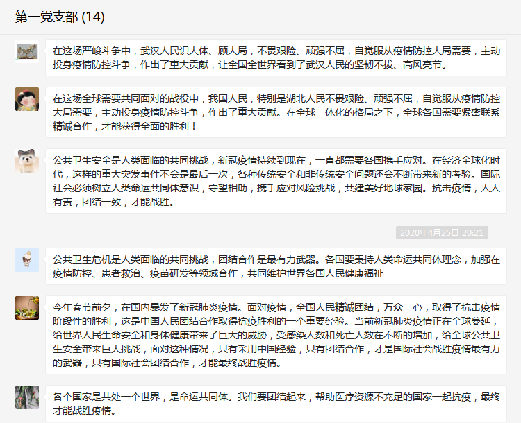 通過學(xué)習(xí),黨員同志紛紛表示,面對疫情,全國人民精誠團(tuán)結(jié),萬眾一心,取得了抗擊疫情階段性的勝利,這是中國人民團(tuán)結(jié)合作取得抗疫勝利的一個重要經(jīng)驗。當(dāng)前新冠肺炎疫情正在全球蔓延,給世界人民生命安全和身體健康帶來了巨大的威脅,受感染人數(shù)和死亡人數(shù)在不斷的增加,給全球公共衛(wèi)生安全帶來巨大挑戰(zhàn),面對這種情況,只有采用中國經(jīng)驗,只有團(tuán)結(jié)合作,才是國際社會戰(zhàn)勝疫情最有力的武器,只有國際社會團(tuán)結(jié)合作,才能最終戰(zhàn)勝疫情。