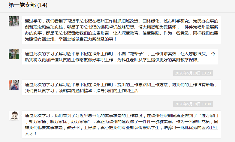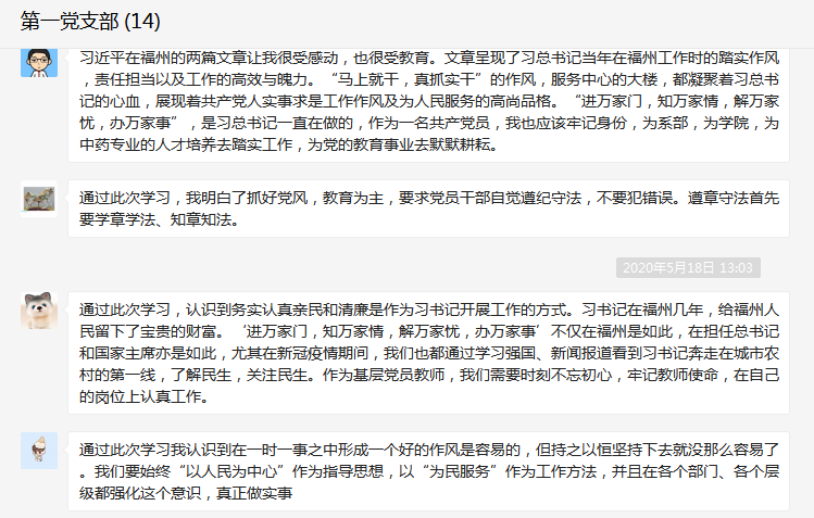 5月16日,藥學(xué)系第一黨支部在微信上在線學(xué)習(xí)《習(xí)近平在福州(五)習(xí)近平為福州人民留下寶貴財富》和《習(xí)近平在福州(六)習(xí)近平同志提出要“進萬家門,知萬家情,解萬家憂,辦萬家事”》兩篇采訪實錄,會議由支部書記何舒瀾主持。