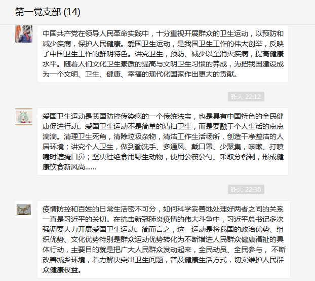 習近平總書記強調“各級黨委和政府要把愛國衛(wèi)生工作列入重要議事日程,探索更加有效的社會動員方式”。6月16日,藥學系第一黨支部通過線上開展“愛國衛(wèi)生運動從我做起”專題學習會,活動由支部書記何舒瀾主持。