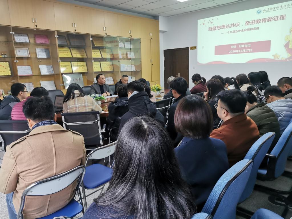 課上,游鋒首先回顧了十九屆五中全會(huì)會(huì)議內(nèi)容,并從“辦學(xué)規(guī)模和質(zhì)量不斷攀升、教學(xué)改革成效顯著、智慧校園基本成型、推進(jìn)校內(nèi)外實(shí)訓(xùn)基地建設(shè)”等四個(gè)方面詳細(xì)闡述了我校教育發(fā)展“十三五”期間取得的顯著成就,最后,立足學(xué)校實(shí)際,結(jié)合高水平職業(yè)院校建設(shè)十大工程重點(diǎn)解讀了學(xué)?!笆奈濉苯ㄔO(shè)發(fā)展計(jì)劃。