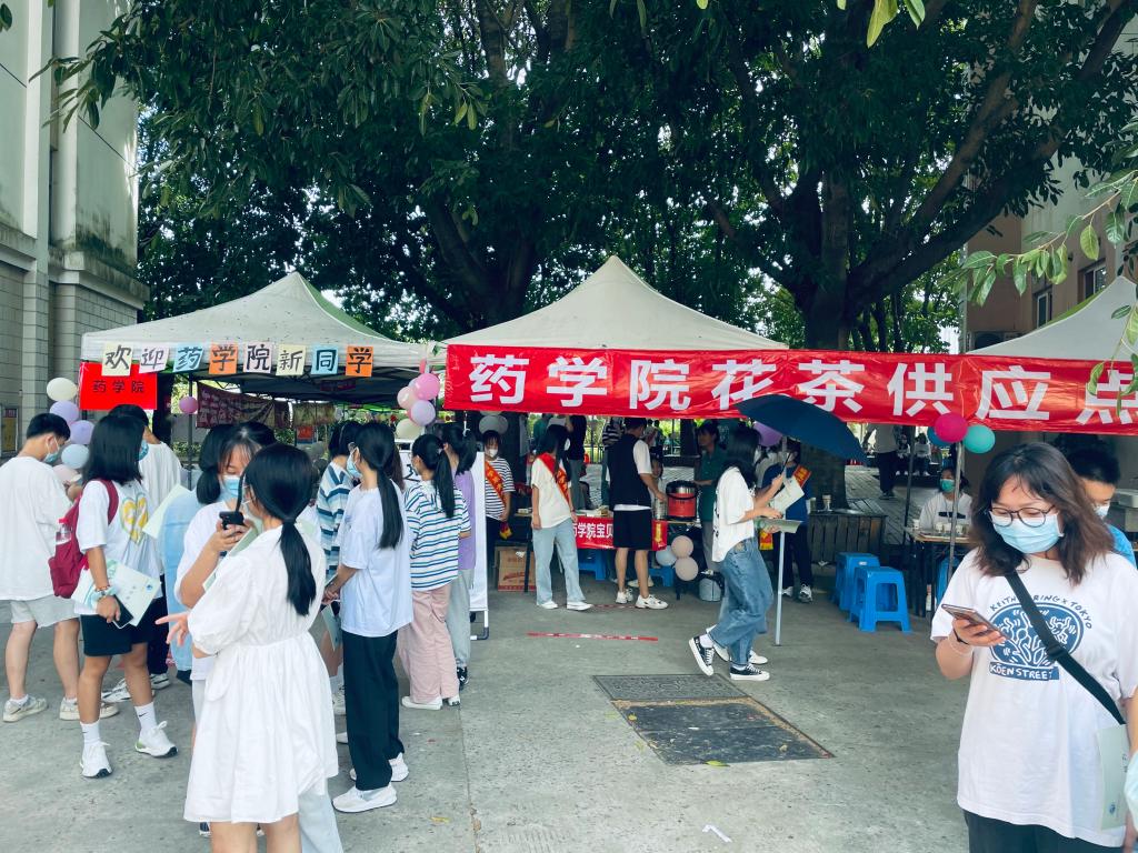 “花茶”迎新是每年藥學院的一大特色,學生們精心調制的花茶為新“伙伴們”送去秋天的第一杯衛(wèi)院溫暖。