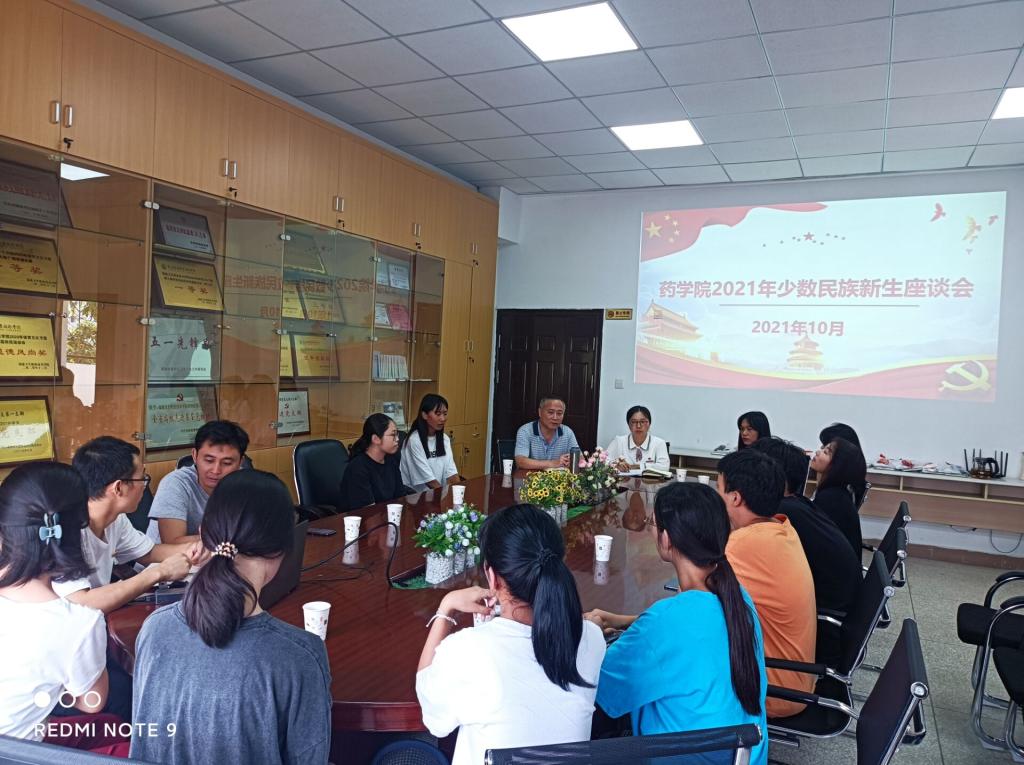 為貫徹落實《新時代愛國主義教育實施綱要》精神,加強對學(xué)生的民族團(tuán)結(jié)教育,做好少數(shù)民族學(xué)生的教育管理服務(wù)工作,2021年10月4日下午,藥學(xué)院在207會議室召開2021年少數(shù)民族新生座談會。藥學(xué)院黨總支書記鄭力宏、副書記賴文金以及學(xué)生第一、第二、第三黨支部書記出席座談會,11個少數(shù)民族(瑤族、土家族、白族、畬族、侗族、高山族、布依族、苗族、藏族、回族、壯族)的學(xué)生分別代表我院2021年38位少數(shù)民族新生參加了座談會,學(xué)生第一黨支部書記鄭衛(wèi)敏主持座談會。