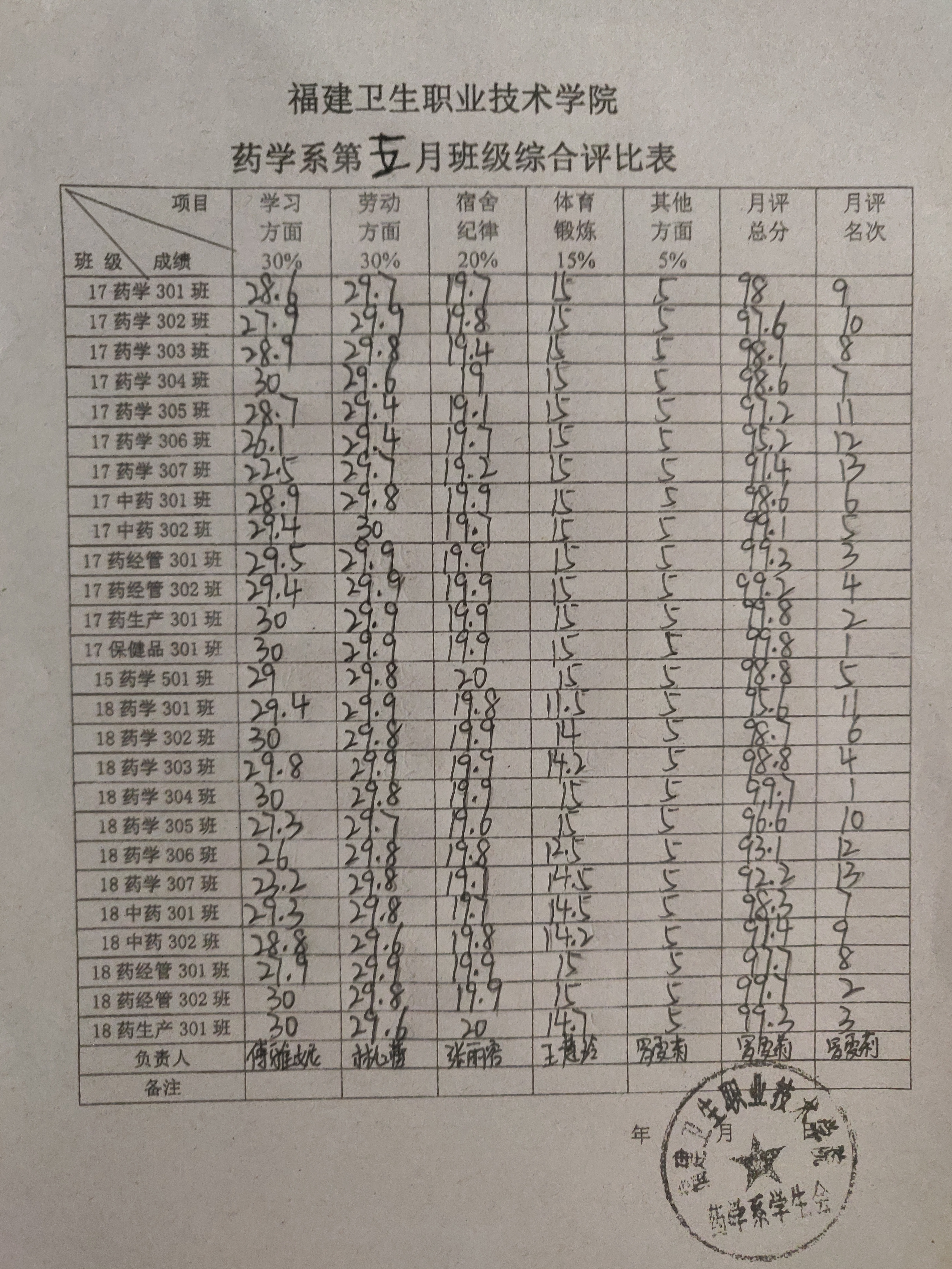 評(píng)比從學(xué)習(xí)情況、勞動(dòng)情況、宿舍紀(jì)律、體育鍛煉幾個(gè)方面入手,依據(jù)各班的表現(xiàn),對(duì)不合格的進(jìn)行扣分,重點(diǎn)考核項(xiàng)目為各班級(jí)日常熄燈情況、教室和宿舍衛(wèi)生狀況、早操出勤率、晚自習(xí)出勤率。三月份第一名由17中藥302班和18藥學(xué)301班獲得,第二名則由17藥生產(chǎn)301班和18級(jí)藥學(xué)303班這兩個(gè)班級(jí)獲得第二名,17藥經(jīng)管302班和18藥生產(chǎn)301班兩個(gè)班級(jí)獲得第三名;四月份第一名由17級(jí)藥學(xué)305班和18藥產(chǎn)301班獲得,第二名則由17藥學(xué)304班和18藥學(xué)301班這兩個(gè)班級(jí)獲得,17藥產(chǎn)301班和18藥學(xué)303班兩個(gè)班級(jí)獲得第三名;五月份17保健品301班和18藥學(xué)304班表現(xiàn)最佳獲得第一名,第二名則由17藥生產(chǎn)301班和18藥經(jīng)管302班這兩個(gè)班級(jí)獲得,17藥經(jīng)管301班和18藥生產(chǎn)301班兩個(gè)班級(jí)獲得第三名。