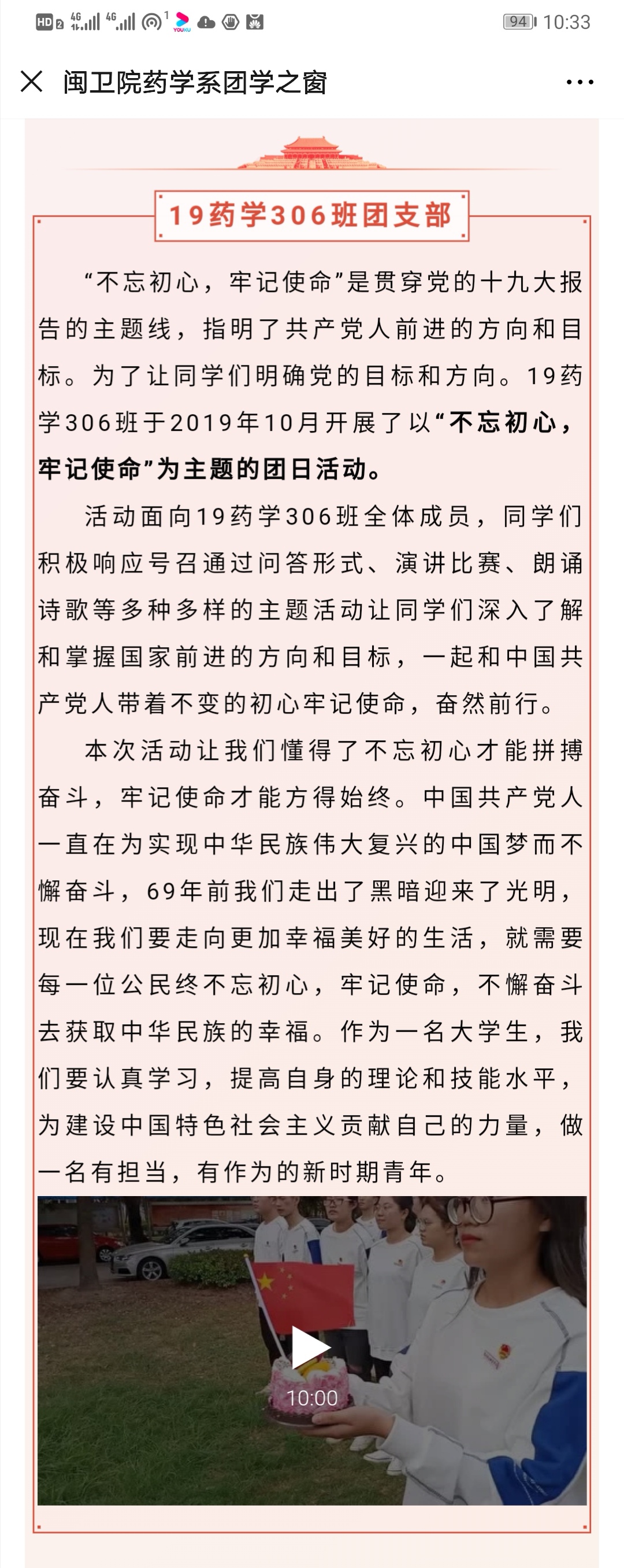 為進一步推進從嚴(yán)治團,激發(fā)基層團支部活力,發(fā)揮主題團日活動在青年學(xué)生中思想引領(lǐng)、價值引領(lǐng)作用,促進主題團日活動制度化、規(guī)范化,增強基層團組織的凝聚力、影響力,藥學(xué)系于2019年10月開展了以“不忘初心、牢記使命”為主題的團日活動。