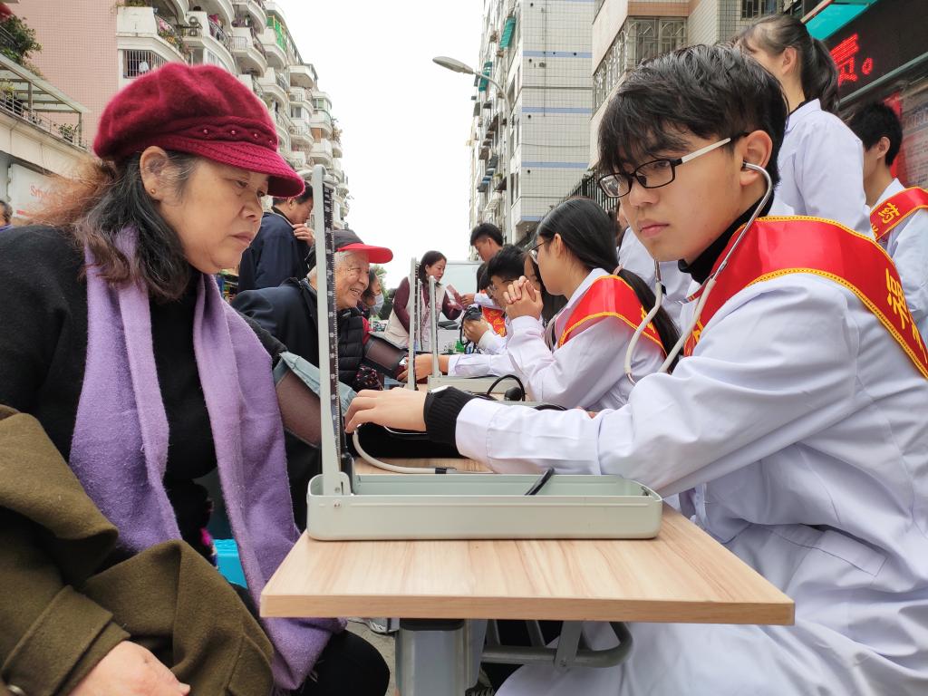 當(dāng)天上午,志愿者們?cè)缭绲氐竭_(dá)社區(qū)進(jìn)行準(zhǔn)備工作,各司其職,各盡其責(zé)?;顒?dòng)開始不久,排隊(duì)群眾就絡(luò)繹不絕。同學(xué)們認(rèn)真、熱情地為每一位居民們提供量血壓、測(cè)血糖、推拿拔罐、健康知識(shí)宣講等義診服務(wù),并對(duì)居民咨詢的問題一一給予解答。同時(shí),還提醒前來就診的老年人要定期進(jìn)行體檢,鼓勵(lì)他們要樹立積極樂觀的生活態(tài)度,對(duì)部分存在亞健康的年輕人建議要規(guī)律作息時(shí)間,合理搭配飲食,養(yǎng)成健康的生活習(xí)慣。