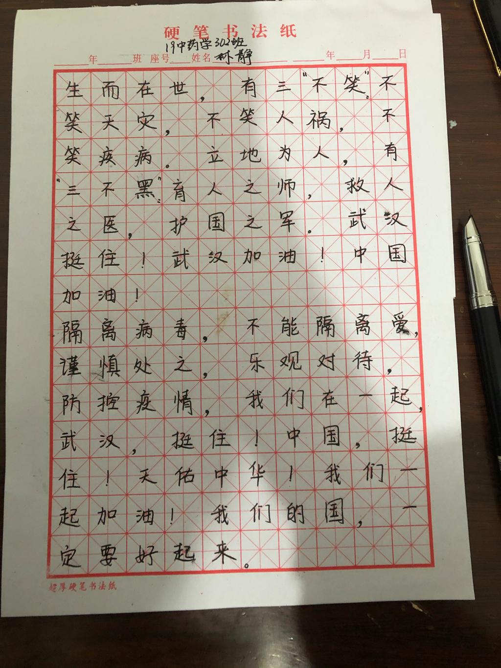 新型冠狀病毒肺炎疫情來勢洶洶,牽動著閩衛(wèi)院學(xué)子的心。藥學(xué)系學(xué)子以書法作品和書信的形式, 積極投身抗擊疫情的歷史洪流,助力抗“疫”。此次活動共收集書法、書信作品七十幾件。筆墨行間對奮戰(zhàn)在疫情前線白衣天使的崇敬之情,對戰(zhàn)勝疫情的信心和決心躍然紙上。同學(xué)們表示將盡自己的綿薄之力,傳播凝心聚力正能量,助力打贏疫情防控阻擊戰(zhàn)。