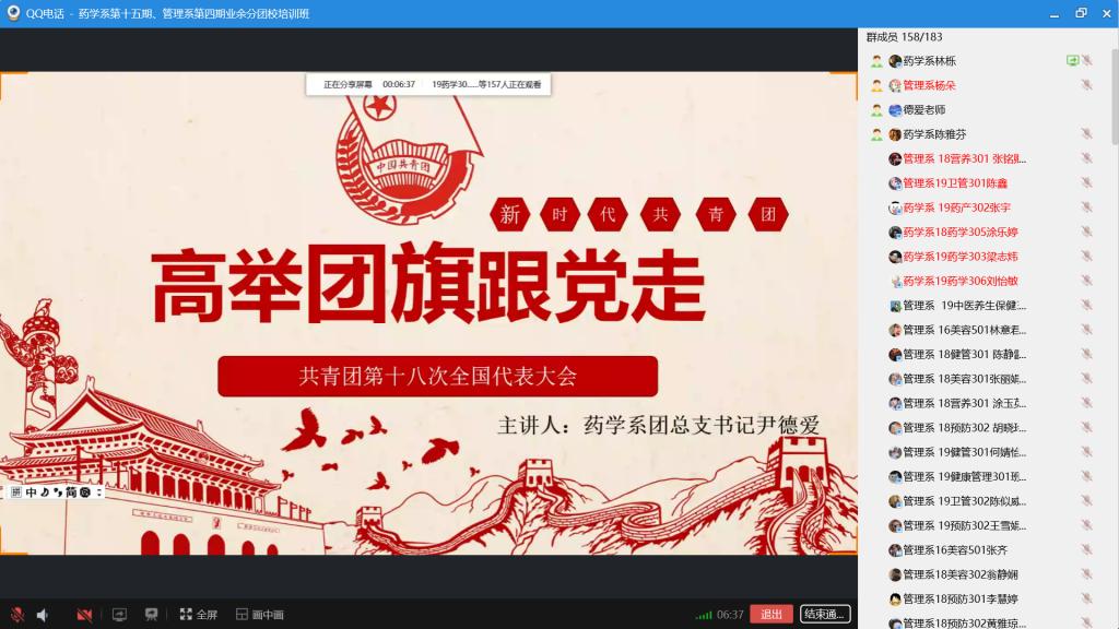 2020年3月5日,為響應(yīng)停課不停學(xué)的號(hào)召,藥學(xué)系團(tuán)總支書記尹德愛(ài)老師利用QQ線上直播的方式為藥學(xué)系第十五期、管理系第四期業(yè)余分團(tuán)校的學(xué)員們講授了主題為“高舉團(tuán)旗跟黨走”的開班第一課。