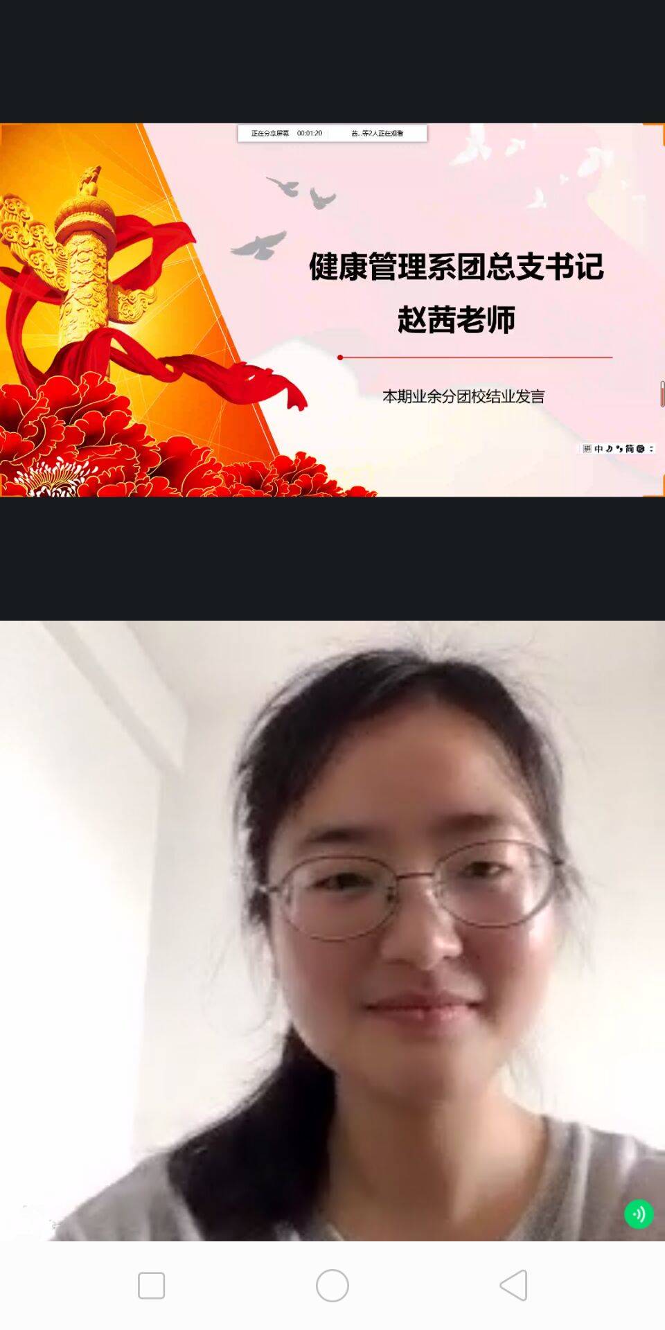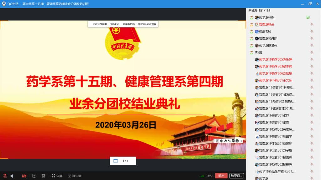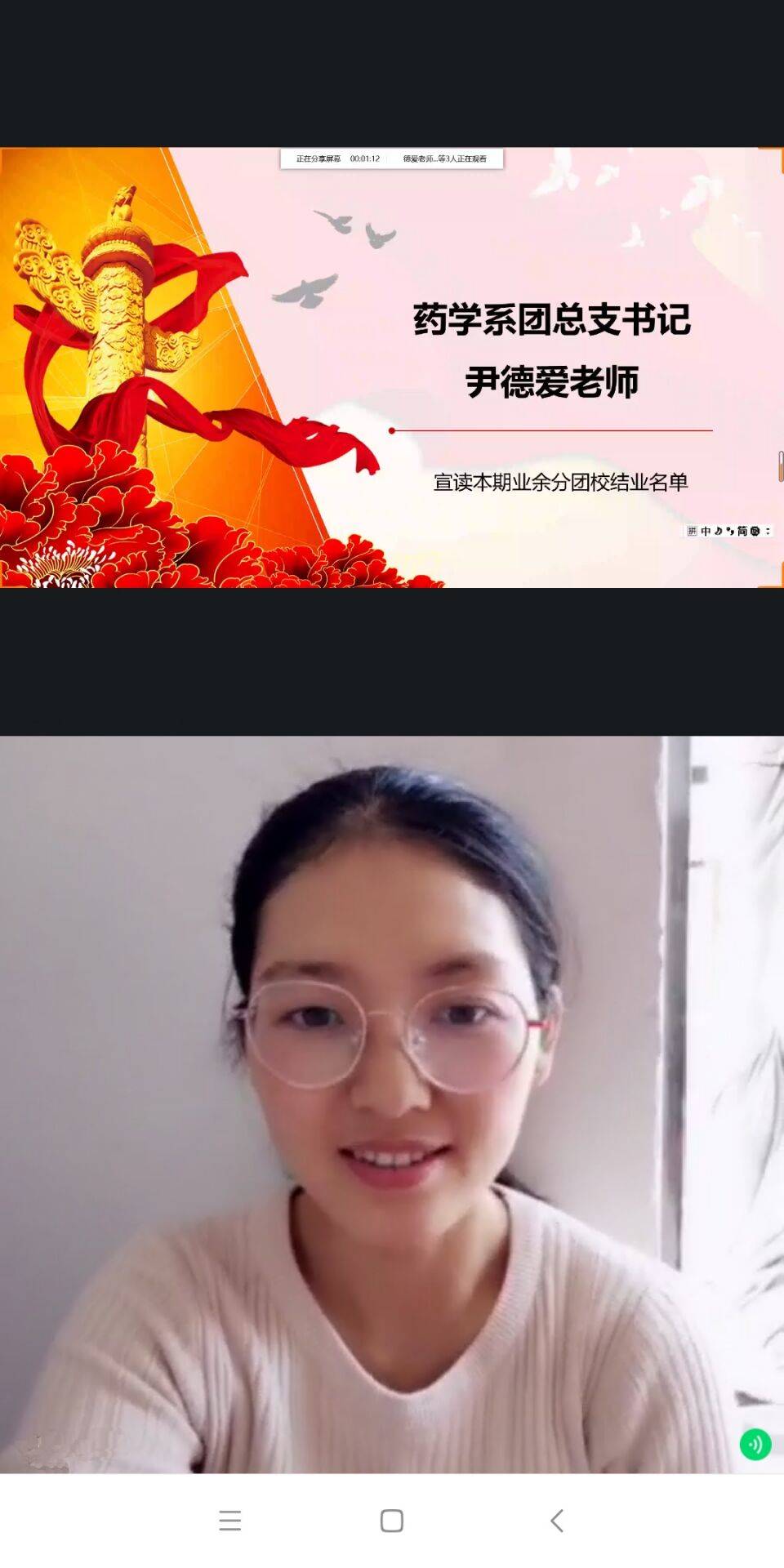 2020年3月26日,藥學(xué)系第十五期、管理系第四期業(yè)余分團(tuán)校結(jié)業(yè)典禮在線上隆重召開,藥學(xué)系團(tuán)總支書記尹德愛老師、管理系團(tuán)總支書記趙茜老師參加了結(jié)業(yè)典禮。