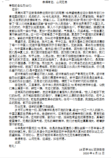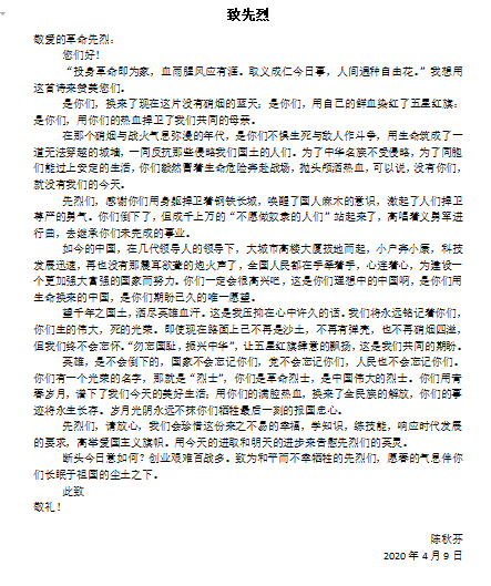 一封書信,銘記感動,傳承信仰。本次活動的開展,使同學(xué)們深切感受到:幸福生活來之不易,當(dāng)下的歲月靜好,不過是總有英雄替我們負重前行!對英烈們最好的紀念就是傳承,青少年要秉承英烈遺志,珍惜幸福生活,發(fā)奮圖強,爭做新時代的追夢人!