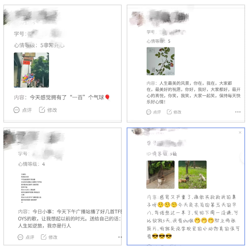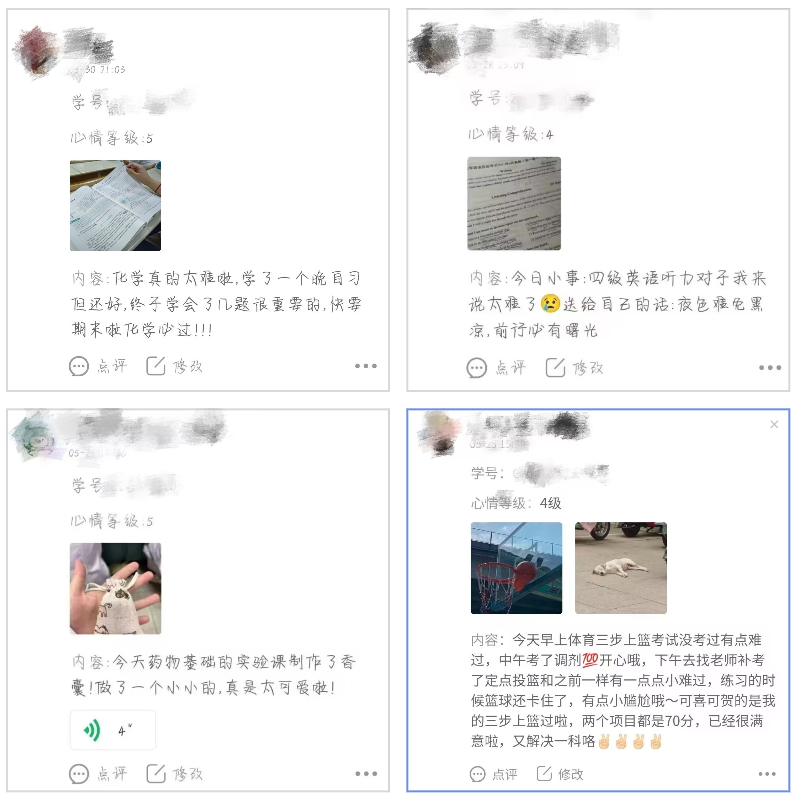 藥學(xué)院以“情緒的聲音”心情日記打卡活動(dòng)為主推特色活動(dòng)。該活動(dòng)吸引了數(shù)百位同學(xué)的積極參與,打卡次數(shù)超千余次。通過活動(dòng),同學(xué)們亦或分享一天美好的心情,亦或借此發(fā)泄一些不好的小情緒?;顒?dòng)中,也有一些同學(xué)紛紛化身“美食收藏家”“宇宙守藏家”“生活中的小確幸兒”,收藏記錄生活中能代表自己心情符號(hào)的照片和文字。