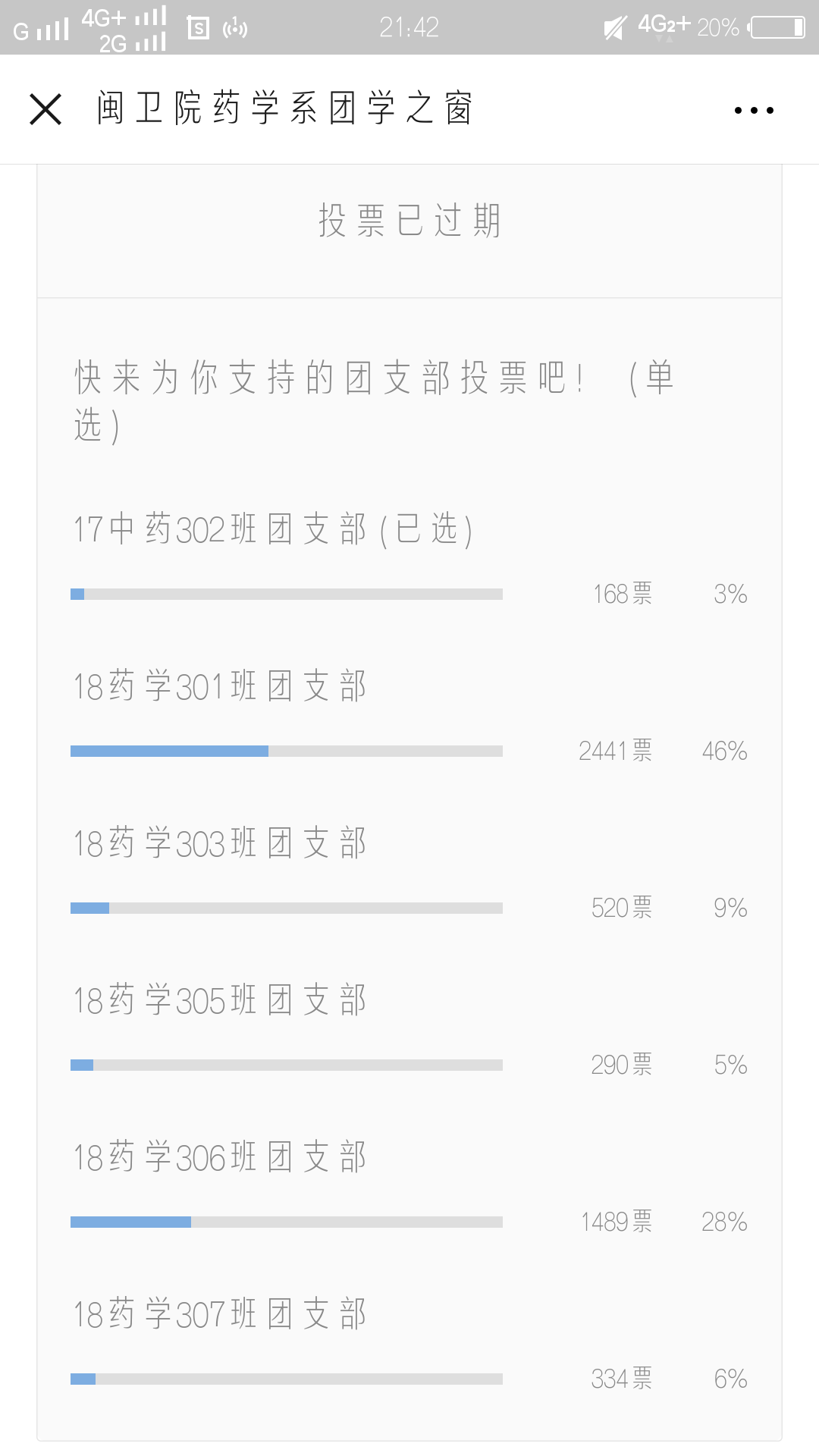 為更好地宣傳此次團(tuán)日活動,本次活動通過各班團(tuán)支部提交的視頻、報(bào)道稿質(zhì)量共評選出了六個(gè)優(yōu)秀團(tuán)支部。并在此基礎(chǔ)上,依托微信公眾號平臺,在平臺上發(fā)起投票,各團(tuán)支部參與其中,為期兩天的網(wǎng)絡(luò)投票,票數(shù)達(dá)5242票,閱讀點(diǎn)擊量達(dá)到7340次。最終,18藥學(xué)306班團(tuán)支部榮獲一等獎(jiǎng)和最佳人氣團(tuán)支部稱號;二等獎(jiǎng)由18藥學(xué)301班團(tuán)支部和18藥學(xué)307班團(tuán)支部獲得;另外三個(gè)團(tuán)支部分獲三等獎(jiǎng),它們分別是:17中藥302班團(tuán)支部、18藥學(xué)303班團(tuán)支部、18藥學(xué)305班團(tuán)支部。
