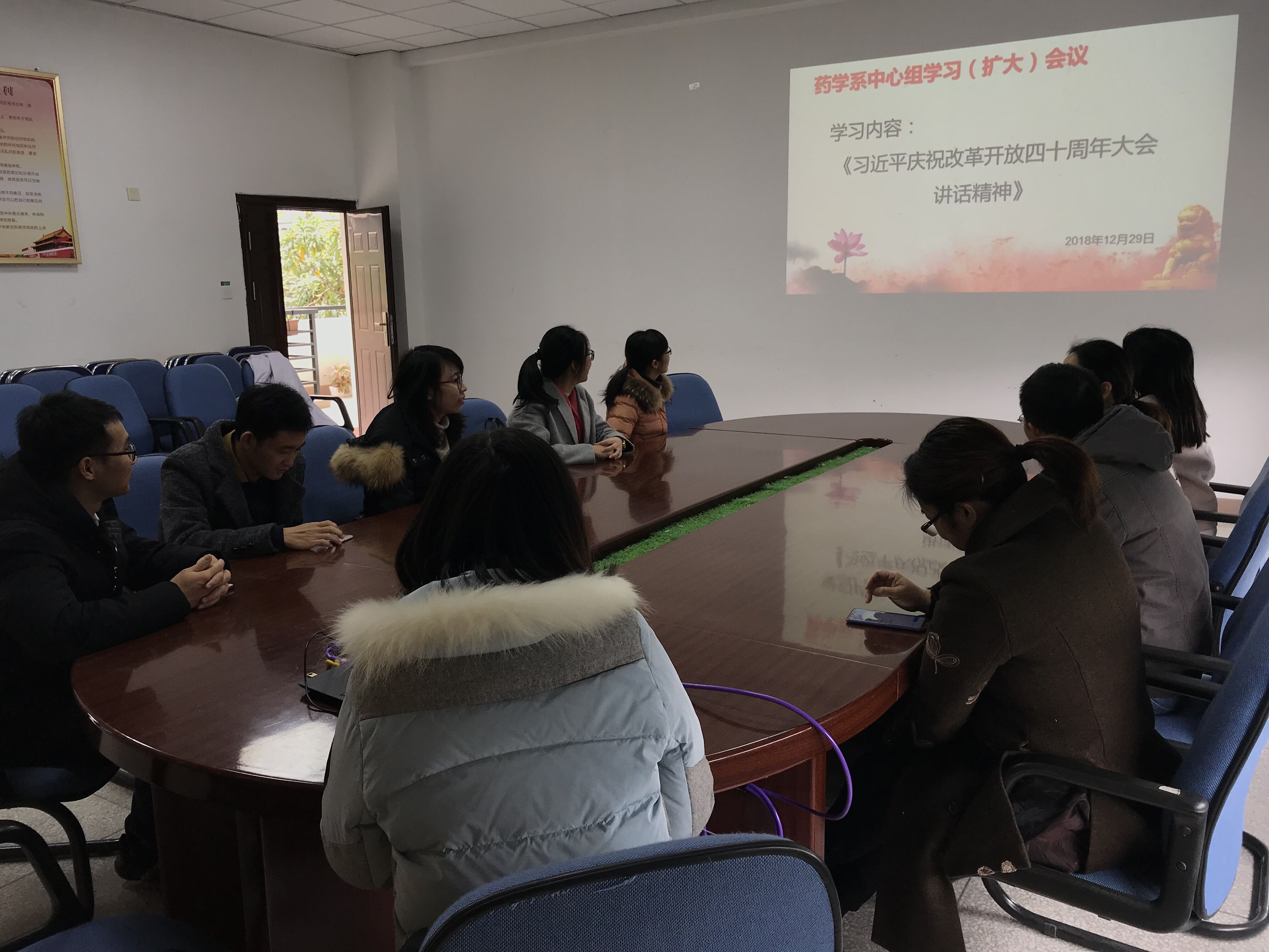 12月29日,藥學系黨總支組織召開中心組學習(擴大)會,專題學習習近平總書記在慶祝改革開放四十周年大會的重要講話精神??傊瘑T、各支部書記及輔導員們參加了本次學習。會議由黨總支副書記陳潔主持。