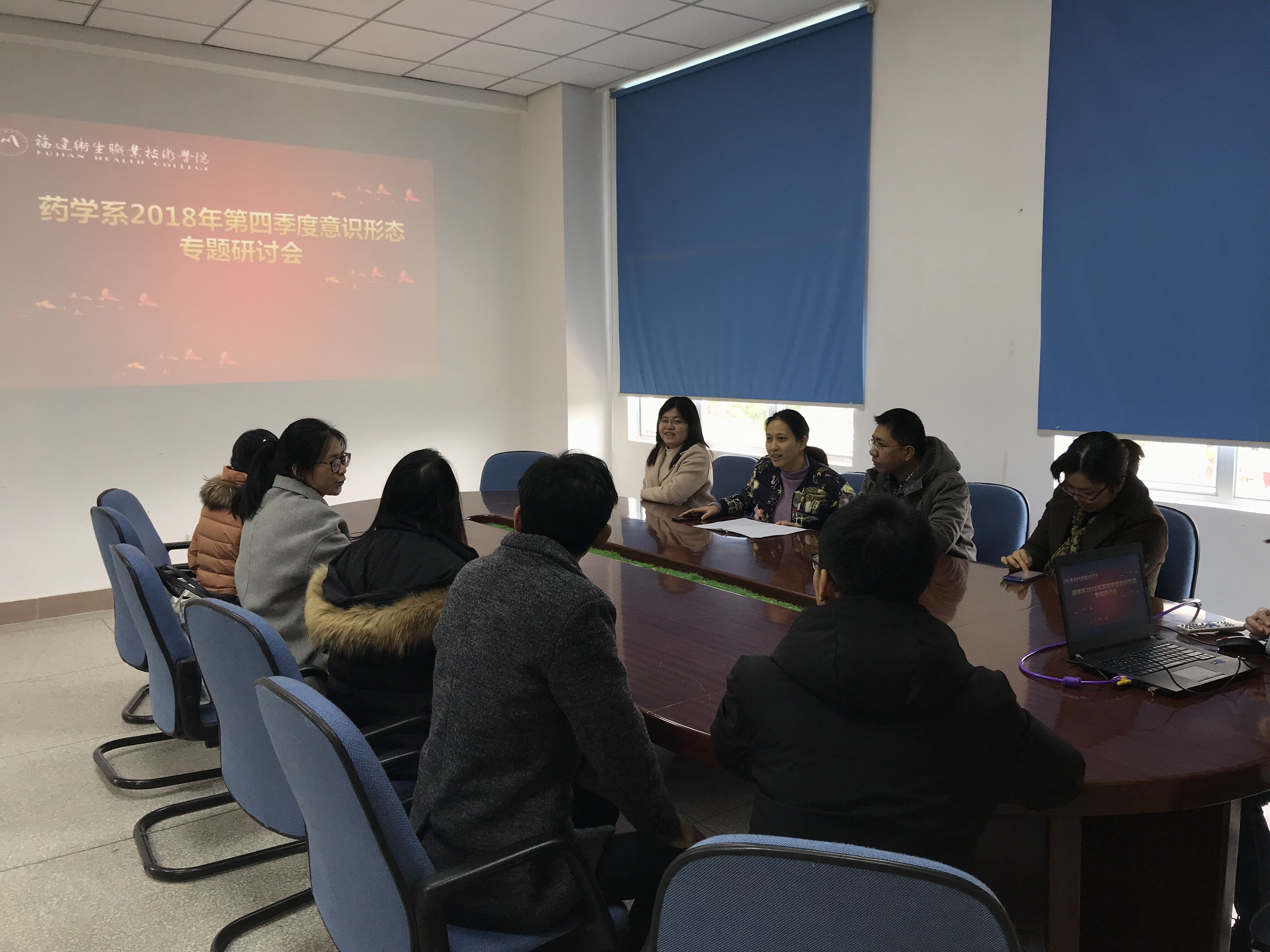 12月29日,藥學(xué)系黨總支召開了2018年第四季度意識形態(tài)工作(擴(kuò)大)會議,藥學(xué)系黨總支委員、輔導(dǎo)員參加了本次會議。本次會議由總支副書記陳潔主持。
