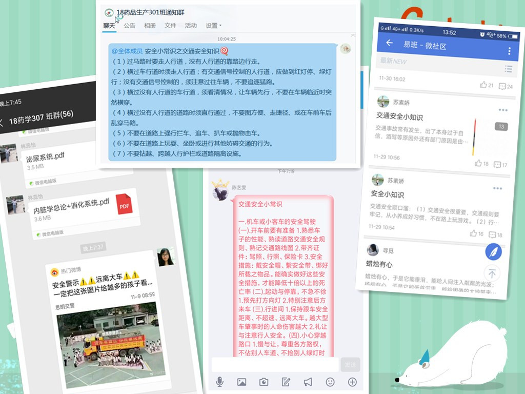 班會上,各班輔導(dǎo)員結(jié)合近期學(xué)院學(xué)生返校途中發(fā)生的交通安全事故以及一些生命安全相關(guān)的真實案例,對學(xué)生進行安全教育,帶領(lǐng)學(xué)生學(xué)習(xí)交通安全知識,強調(diào)做好安全文明出行的每個細節(jié)。此外,還通過班級QQ群、微信群、易班平臺等發(fā)送交通安全小知識。